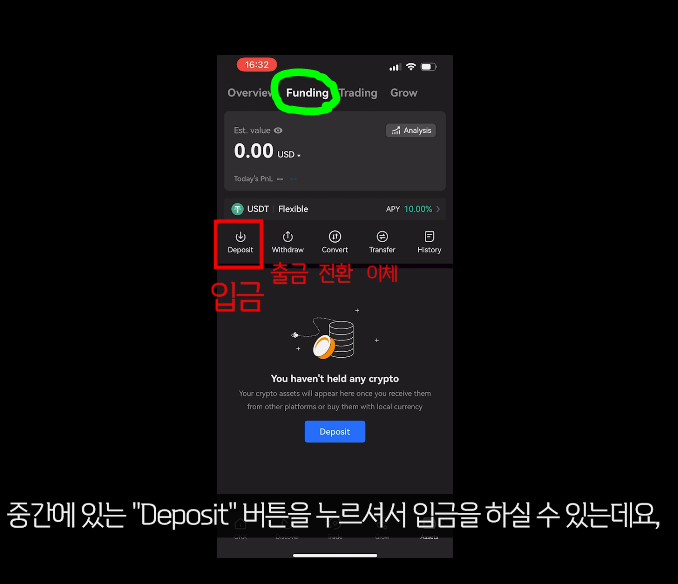 상단에 "Funding"에서 "Deposit(입금)" 클릭